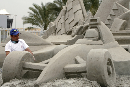 Raymond Wiyrick from the U.S. builds a sand sculpture of Formula 1