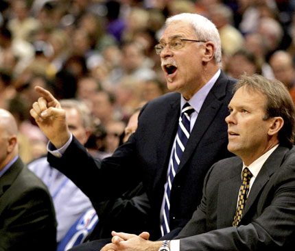 Los Angeles Lakers head coach Phil Jackson (L) and assistant coach Kurt Rambis (R) yell out during the third quarter of their NBA basketball game against the Phoenix Suns in Phoenix, Arizona, April 13, 2007. [Reuters]
