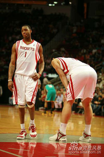 Houston Rockets Tracy McGrady (L) and Yao Ming wait for free throws of New Orleans Hornets during their NBA basketball game Saturday, April 14, 2007, in Houston. The Rockets won 123-112 and Yao Ming scores 30 points. [sina]