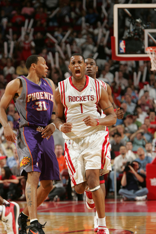 Tracy McGrady #1 of the Houston Rockets celebrates after scoring at the Toyota Center April 16, 2007 in Houston, Texas.[AP]