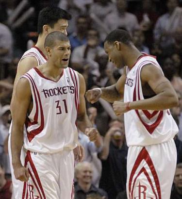 Houston Rockets Tracy McGrady (R) playfully punches teammate Shane Battier (31) after the Rockets beat the Phoenix Suns in their NBA basketball game in Houston April 16, 2007. The win gave the Rockets home court advantage in the first round of the upcoming NBA Playoffs. Behind is Rockets Yao Ming of China. [AP] Click here for more photos of the game