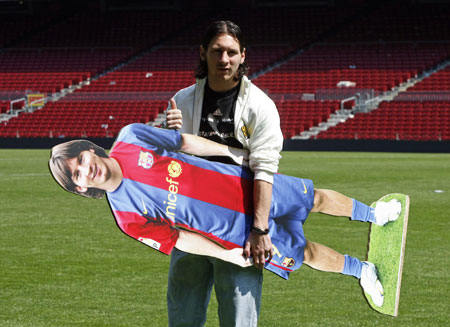 Barcelona's Argentine Leo Messi poses with his figure at Nou Camp Stadium in Barcelona, April 19, 2007. Messi said he hopes former Argentina great Diego Maradona returns to full health soon, the day after scoring a goal similar to Maradona's classic solo effort against England at the 1986 World Cup. [Reuters]