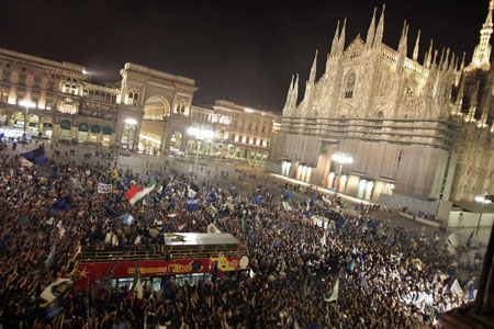 A bus carries the triumphant Inter Milan soccer team through Duomo square in Milan April 23, 2007, as they celebrate after winning the Italian first division soccer title. Inter Milan secured their 15th Serie A title on Sunday to clinch their second successive Serie A title with five games to spare.[Reuters] ![]()
