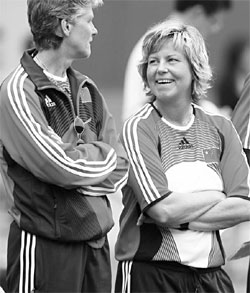 New coach calls for confidenceBy Chen Xiangfeng (China Daily)Updated: 2007-04-26 08:19 Marika Domanski-Lyfors (right), the newly-appointed head coach of China's women's soccer national team, exchanges words with her assistant during a training session last week in Wuhan.