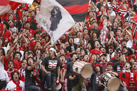 Fans of the Urawa Reds soccer team sing during their match with Shanghai Shenhua during the AFC Champions League 2007 in Shanghai April 25, 2007.[Reuters]