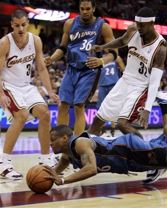 Gooden's performance came exactly one year after he had 24 points and 16 rebounds in Game 2 of the Cavs' first-round series against the Wizards. Cleveland lost that game before winning the series in six. But the 6-foot-10 Gooden, who is growing out an 1980s-style ducktail hairdo, helped make sure recent history wouldn't be repeated. The Wizards, though, made it interesting in the final minute. They kept pecking away at Cleveland's lead and closed within 105-102 on a 3-pointer by Jarvis Hayes with 18 seconds left. Larry Hughes then made four free throws as Cleveland closed it out and sent the best-of-seven series to Washington for Game 3 on Saturday. James, who twisted his ankle in Game 1, still managed to get 27 points, eight rebounds and seven assists -- roughly his average this season. And when the Wizards trimmed a 15-point deficit in the fourth quarter to six, James took control. He scored 13 points in the final period, including nine in the final 5:14. But other than a two-handed dunk in the first half and couple of powerful excursions toward the hoop, James seemed to take it easy on an ankle he said is still sore. Once again, Antawn Jamison had to do it alone for the Wizards, who are without injured All-Stars Gilbert Arenas and Caron Butler. Jamison had 31 points but Antonio Daniels (11) was the only other Washington starter in double figures. Hughes had 19 points and Zydrunas Ilgauskas added 16 for the Cavs, who have only been up 2-0 in a series one other time in their 37-year history. Before the game, James said he still had pain in his ankle but he didn't expect to have any trouble playing on it. "It's not 100 percent," he said. "It's (pain) is going to be there for a while." James gave Cleveland fans a few moments of concern when he didn't immediately come out with his teammates for pregame warmups. But moments later, he burst onto the floor and began testing his injury with some strong moves. Once the game began, he wasn't as assertive as normal, and the Wizards took advantage, opening a 43-36 lead on a basket by Jamison. Gooden then brought the Cavs back by himself. He scored 15 points -- and Cleveland's final 11 -- in the last 5:45 of the second quarter, hitting six straight contested jumpers and scoring two three-point plays as the Cavs took a 51-48 halftime lead. After dropping a 19-footer and getting fouled with 28.5 seconds left, Gooden screamed and bumped chests with James as the sellout crowd serenaded Cleveland's No. 90 with a chorus of "Druuuuu." James seemed reluctant to push off on his ankle early. He spent most of the first quarter out on the perimeter, looking to pass to his teammates. He didn't make his first drive until the 1:43 mark when he was fouled for a three-point play. Wizards coach Eddie Jordan wanted more from Etan Thomas, who scored just four points in Game 1, and Washington's center responded with seven points in the first quarter. But he scored only two more and Washington's frontline got pounded on the boards 56-38. |