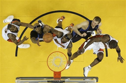 And after dominating both ends of the court in another improbably comfortable win over the mighty Mavericks, the Warriors are halfway to what probably would be the biggest first-round upset in NBA playoff history. The biggest crowd in Warriors history -- 20,629 yellow-clad fans packed into the rafters of Oracle Arena -- rarely sat down during Oakland's biggest party in years. The fans chanted "Overrated!" at the flustered Mavs and Dirk Nowitzki, who had 20 points and 12 rebounds in another poor performance. Game 4 in the best-of-seven series is Sunday night in Oakland, with Game 5 back in Dallas on Tuesday. Stephen Jackson scored 16 points and Monta Ellis had 14 for the Warriors, who extended their uncanny Mavs mastery with their seventh win in the clubs' last eight meetings overall, including a three-game regular-season sweep. The Warriors led throughout the final 44 minutes, taking an 18-point lead in the first half and going up by 22 in the third quarter before coasting home. Richardson was largely unstoppable, mixing drives with four 3-pointers in the six-year veteran's first playoff showcase at home. So what's wrong with the Mavs? Not even coach Avery Johnson seems to know. After winning 67 games during the sixth-best regular season in NBA history, the Mavericks have looked inexplicably ordinary against the Warriors' speed and skill. Nowitzki battled constant foul trouble in Game 3, and Golden State's hustling defense somehow turned the probable league MVP into a bumbler or a bystander on most Dallas possessions. His teammates were little help outside of Josh Howard's 20 points, with Jason Terry and Jerry Stackhouse both enduring poor shooting nights. The Warriors shocked Dallas 97-85 in Game 1 with their uptempo offense and fearless play, but fell apart in the second half of an otherwise competitive Game 2. Davis and Jackson were ejected, and Jackson was hit with a $50,000 fine from the league Friday for his behavior. But Golden State regained its momentum and maturity back home -- and Nelson tweaked the Mavs again with a new starting lineup, inserting Andris Biedrins in place of struggling Al Harrington to change the Mavericks' matchups. Harrington started the Warriors' final 42 regular-season games and both playoff games in Dallas after arriving in a trade with Indiana, but Biedrins had 10 points and 10 rebounds in Game 3. Nowitzki, who struggled for long stretches of the first two games, scored the Mavericks' first eight points, but Golden State jumped to an 11-point lead late in the first quarter on Richardson's first 3-pointer, inciting the crowd to deafening noise. The Warriors controlled the tempo and the Mavericks missed open shots while Golden State took a 61-48 halftime lead. Davis was brilliant in scoring Golden State's final basket -- rolling off Biedrins' pick and herding Nowitzki into the paint before banging home a layup and drawing Nowitzki's third foul with 3 seconds to go. The Mavs' frustration bubbled over in the third quarter, with Howard, Stackhouse and Devin Harris all picking up technical fouls. |