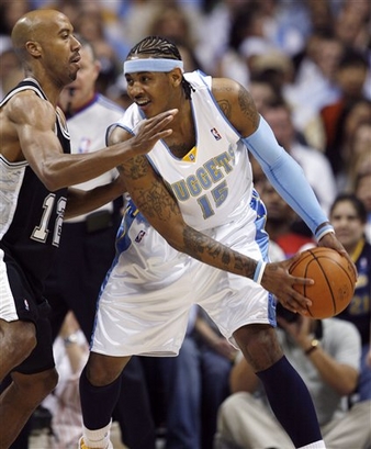 A flurry of 3-pointers from Robert Horry (10 points) and Michael Finley (16) allowed the Spurs to break away from the Nuggets late in the third quarter. Finley started it off with a 3 that gave San Antonio a 64-62 lead. After a jumper by Allen Iverson tied it, Ginobili sank two free throws, then Horry stole the ball from J.R. Smith under the basket and sank his own 3-pointer for a 69-64 lead. The Nuggets, who got 28 points from Carmelo Anthony and 20 from Iverson, never recovered. Iverson and Smith got tangled up going for a rebound and Finley raced downcourt for another 3 that made it 72-64 with 1:02 left in the quarter, forcing a timeout. Horry then set up in the right corner and sank another 3-pointer to give San Antonio a 75-67 lead going into the fourth quarter. Smith, in the game for his 3-point prowess, was whistled for a flagrant foul on Ginobili, whose two free throws made it 77-67. The Nuggets trimmed their deficit to five points on several occasions and got within three in the final seconds, but a series of forced shots that clanged off the iron doomed Denver to another home loss and returned the home-court advantage to San Antonio, which lost Game 1 at home before winning the next two. Horry's jumper with 42 seconds left made it 94-87, but Smith made a shot and 'Melo's layup with 7.8 seconds made it 94-91. Ginobili sank two free throws with 4.5 seconds left to ice it. Iverson, who missed 16 of his 25 shots in Denver's Game 2 loss, was just 3-for-10 in the first half and finished 7-for-20. Nene added 18 points. Nuggets center Marcus Camby accepted his award for Defensive Player of the Year in pregame ceremonies, then quickly tried his hand at offense, but was just 1-for-6 in the first quarter and committed an offensive foul on another drive to the basket. The Spurs hit two clock-beating 3-pointers in the closing minutes of the first quarter to trim an early eight-point deficit to 25-22. The first one was Parker's and came after Finley sank a free throw when Denver coach George Karl drew a rare technical from official Bob Delaney for leaving the coach's box while arguing for a call. The Spurs took a 43-40 halftime lead after dictating another slow-paced game. Although the Nuggets had gotten next to nothing offensively from reserves Smith, Eduardo Najera and Linas Kleiza in the first two games, Karl insisted he wasn't concerned. "I've never coached a game thinking I need more bench points," Karl said before tip-off. "Now, after I've looked at the stat sheet, I've said, 'I didn't get much from my bench."' He'll be saying that again, as the Nuggets' reserves were outscored by San Antonio's 33-12 -- with all of Denver's points coming from Smith. |