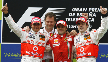 celebrate on the podium after the Spanish Grand Prix at the Circuit de Catalunya