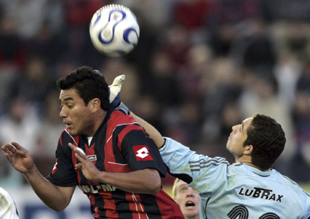 River Plate's Juan Pablo Carrizo (R) fights for the ball with San Lorenzo's Roberto Jimenez during their Argentine First Division soccer match in Buenos Aires May13, 2007. [Reuters]