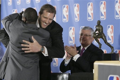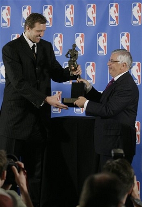 It also was the rare instance of the honor going to a player who couldn't get his team out of the playoffs' first round, but commissioner David Stern, Dallas coach Avery Johnson and Mavericks owner Mark Cuban did their best to keep the focus on the things Nowitzki did right this season and throughout his nine-year career. Stern praised Nowitzki as "an iconic, elite athlete from Europe who has not only learned to play our game, he's mastered it." Cuban became emotional talking about his star player's work ethic and desire. "You don't have to encourage him to get into the gym, he's the guy you have to lock out," Cuban said. "He's not the guy who you wonder if he cares, he's the guy who hurts so much when things don't go the way you want. That's what makes him an MVP. He's an example ... that you don't have to fit a certain role, a certain model, but if you work hard enough and care enough, anything is possible." About the only person dragging the mood down was Nowitzki. "Even when I heard I was MVP, I was sad to watch all these playoff games and know that we're not a part of it," Nowitzki said. "It's heartbreaking still to me. I was trying to be positive and be really happy, but it's going to take a while for it to really sink in." Nowitzki led the Mavericks to 67 wins, a total eclipsed by only five teams in NBA history. He was the team's top scorer (24.6 points per game) and rebounder (8.9 per game), and averaged a career-high 3.4 assists. He also was the only player in the league to shoot better than 50 percent from the field, 40 percent on 3-pointers and 90 percent on free throws. He was listed first on 83 of the 129 ballots, garnering a total of 1,138 points, to end the two-year MVP reign of his close friend and former teammate Steve Nash of the Phoenix Suns. "I'm extremely proud of him and happy for him," Nash said. "I think it's really well-deserved. Hopefully he gets a chance to enjoy it regardless of their playoff outcome, because he had a phenomenal year and he really deserves it." Nash finished second with 1,013 points and 44 first-place votes. He could have joined Larry Bird, Wilt Chamberlain and Bill Russell as the only players to be named MVP in three straight years.
