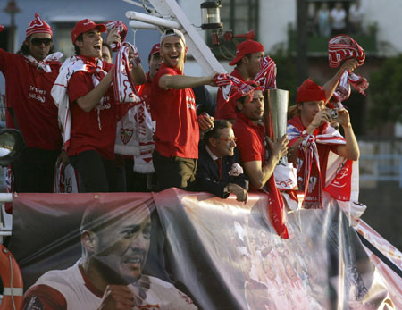 Sevilla players celebrate their UEFA Cup victory as they ride through central Seville on a boat with the trophy May 17, 2007. Sevilla won 3-1 on penalties after drawing 2-2 after extra time against Espanyol at Hampden Park Stadium in Glasgow May 16, 2007.[Reuters]
