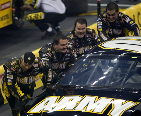 Pit crew for the Mark Martin U.S. Army car push their car to the finish line