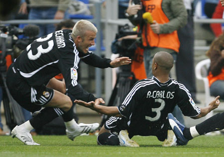 Real Madrid's Roberto Carlos (R) celebrates with David Beckham after scoring against Recreativo Huelva during their Spanish First Division soccer match at Nuevo Colombino stadium in Huelva May 20, 2007. [Reuters]