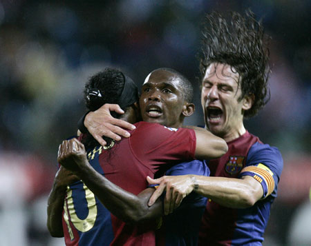 Barcelona's Samuel Eto'o (R) is congratulated by his team mates Ronaldinho and Carles Puyol (R) after scoring against Atletico Madrid during their Spanish first division soccer match at Vicente Calderon stadium in Madrid May 20, 2007.[Reuters] ![]()