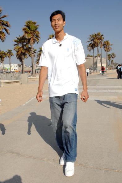 China's NBA prospect Yi Jianlian plays at the seaside during his spare time among the coming NBA draft in June. [sina]