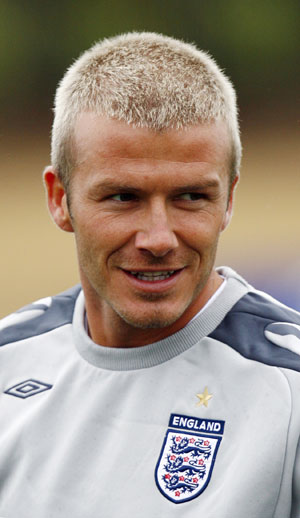 England's David Beckham smiles during a soccer training session in London Colney May 28, 2007 ahead of the friendly match against Brazil.[Reuters]