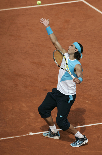 Spain's Rafael Nadal serves to Australia's Lleyton Hewitt at the French Open tennis tournament at Roland Garros in Paris June 4, 2007.[Reuters]