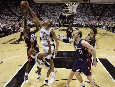 Cleveland Cavaliers' LeBron James (L) is stuffed by San Antonio Spurs' Tim