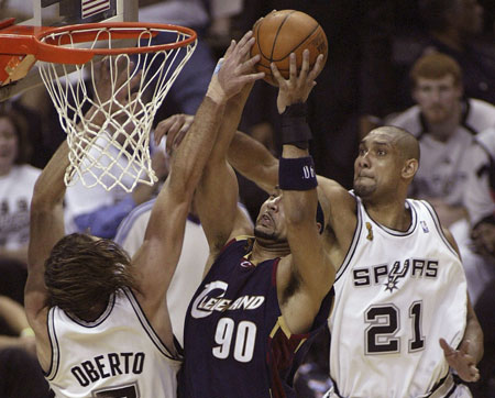 Cleveland Cavaliers' Drew Gooden (C) is stopped from scoring by San Antonio Spurs' Tim Duncan (R) and Fabricio Oberto during Game 1 of the NBA Finals basketball series in San Antonio, Texas, June 7, 2007. The Spurs took a 1-0 lead with a 85-76 win. [Reuters]