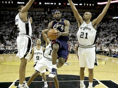 Tim Duncan had 24 points, 13 rebounds and five blocks, and Tony Parker added 27 points and seven assists for the Spurs, who began their quest for a fourth championship since 1999 with a defensive clinic on James and the Cavs, making their first appearance in the finals. With the eyes of Texas, a curious hoops nation and the world upon him, the 22-year-old James, who has rarely failed to rise to any occasion, flopped like never before. James shot just 4-of-16 from the field and finished with 14 points and six turnovers in 44 exhausting minutes. Led by Bruce Bowen, their top defensive agitator, the Spurs grounded Cleveland's soaring superstar. "If I went by one guy, another guy stepped up," James said. "For us to have a chance to win, I have to play better." This was hardly the series opener James, the NBA or ABC-TV executives, had hoped for. James' first foray into the finals was hyped in the days leading up to the game as many wondered if he could deliver the way Michael Jordan once did. But James wasn't close to being Jordanesque, and he came nowhere near matching His Airness' first game in the finals when he scorched the Los Angeles Lakers for 36 points on June 2, 1991. Game 2 of the best-of-seven series is Sunday night in San Antonio. Games 3, 4 and 5 (if necessary) will be in Cleveland. The Spurs' game plan was to make it tough for James to score. They made it nearly impossible as Bowen forced him toward the sideline and away from the lane — his personal runway to dunks. "We did a very good job on LeBron, not giving him the lanes that he's used to," Duncan said. "It takes five guys understanding what we're doing, understanding a game plan and sticking with it." The Spurs, who lost twice to the Cavaliers during the regular season, seemed to be one step ahead of James all night. When he cut left, they cut him off. When he tried going right, they were right there. By the time James made his first outside jumper — a 3-pointer with 6:54 left — the Spurs had built a 74-59 lead. By then, the Spurs had squeezed the life out of Cleveland and its young star. "LeBron is the head of the snake," Spurs forward Robert Horry said, "and we need to cut that head off." The 31-year-old Duncan, labeled boring because of his lack of flash, did what he always does: dominate. The Big Fundamental knocked down open jumpers, freed up teammates with crunching picks and generally had his way against Cleveland's frontline for San Antonio, which was lifted by its crowd's incessant chants of "Go, Spurs, Go." Parker, too, was on top of his game. The speedy point guard slashed and sliced past Larry Hughes and James for easy layups. "We have to make the game harder for him," Hughes said. It couldn't have been any tougher for James. After missing his first eight shots, he finally got his first field goal with 7:15 left in the third quarter, blasting down the lane through a pack of Spurs to hit a scoop shot that brought the Cavs within 46-41. But Bowen responded with a 3-pointer, Manu Ginobili hit another from long range and Duncan dished to Parker for a layup to make it 56-47. On the Spurs' next trip, Parker weaved his way inside and dropped in a layup, the ball sitting on the rim for several seconds before finally falling. The Spurs eventually pushed their lead to 64-49 after three, and then opened the final period with 3-pointers by Horry and Ginobili to open their biggest lead, 70-52 with 8:50 left. Two 3-pointers by James and a few jumpers by rookie Daniel Gibson, who led the Cavaliers with 16 points, cleaned up the score but it wasn't nearly that close as Cleveland shot under 40 percent until a late barrage. "They started to do a good job towards the end of the game," Duncan said. "They got a couple of layups and a couple of easy shots. We'll have to clean that up a little bit." James left with 45 seconds to go, dejectedly slumping into his seat after a night he'd probably like to forget. "He struggled mightily," Cavs coach Mike Brown said. "They closed down the paint, and we tried to pick-and-roll with him. When he did get in the paint, he wasn't able to finish because they were bringing bodies, not just one, but two, three bodies." Before taking the floor for their first finals game in Cleveland's 37-year history, the Cavaliers huddled near the tunnel for a prayer. Then, James and his teammates repeated something they've done since the first day of training camp. "One, two, three, championship," they shouted in unison. But it became clear very early on that any climb to a title would be steep. The Spurs, who hadn't played in a week since beating Utah in the Western Conference finals, showed no early rust. They started 7-of-9 from the field as Parker and Duncan combined for 14 of San Antonio's first 16 points as San Antonio opened a 20-15 lead after one. Every time James took off for the basket, the Spurs seemed to multiply in his face. On one drive, he had his headband yanked off by Duncan, who got posterized on a dunk by James in the first meeting between the teams in November. Seven months later, Duncan got even. On the occasion of his fourth finals, the three-time finals MVP, arrived at the arena with a freshly shaved head — typically a sign that he's ready to rumble. He has been reluctant to talk about his place in history or the Spurs' ascension to a dynasty level. But if this game was any indication, San Antonio may soon be recognized as one of the league's great powers. Unless, of course, James figures out a way to get to the basket or get his jumper to fall. "A lot of shots I took, I usually make," he said. "Things like that happen. You have one off night, but it's not like the NCAA tournament where you have one game and you're out. We've got to regroup." |