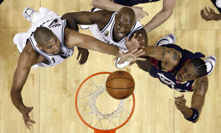 San Antonio guard Manu Ginobili, however, was fouled while hitting a three-point shot and his four-point play hiked the Spurs lead to 101-89 with just 2:24 to go. Guard Tony Parker paced the Spurs with 30 points, hitting 13 of 20 shots on a variety of jumpers and running one-handers through the lane. Ginobili finished with 25 points with forward Tim Duncan adding 23 on nine of 16 shooting. LeBron James scored 25 points but was ineffective until Cleveland's late charge. Cleveland outscored San Antonio 30-14 in the final period but was unable to complete the comeback. The best-of-seven series shifts to Cleveland for games three, four and, if necessary, five. San Antonio was so dominant in the opening half that few would have bet against them going on to win their third championship in the last five years. The Spurs went on a 12-0 run with James on the bench to stretch a 16-13 first-quarter lead to 28-16. James played only three minutes of the opening quarter after picking up his second foul with 9:05 left in the period. The Spurs were dominant in every statistical category, much to the delight of the near 19,000 fans in the AT&T Center, and limited James to 13 points at the break with some double-teaming defense. The Cavaliers shot only 26.8 percent in the opening half, including just one of eight from three-point range. |