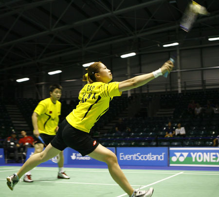 China's Gao Lin (R) and Zheng Bo return a shot to Thailands' Songphon Anugritayawon/Kunchala Voravichitchaikul during their mixed doubles game of the first round match of Sudirman Cup Badminton Tournament in Glasgow of England June 12, 2007. Defending China swept a 5-0 win. [Xinhua]