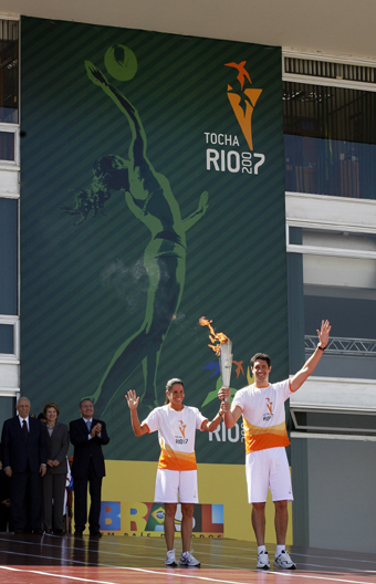 Former Brazilian swimmer Gustavo Borges (R) and beach volley player Sandra Pires hold the official torch for the Pan American Games after ceremony outside Planalto Palace in Brasilia, June 11, 2007. The torch is being carried on a circuit around the country before the start of the Games on July 13 in Rio de Janeiro. REUTERS/Jamil