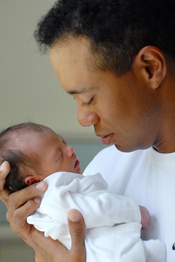 Golfer Tiger Woods carries his daughter Sam Alexis Woods in their residence in Florida June 23, 2007, in this handout released June 25, 2007. [Reuters]