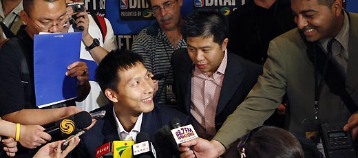 Yi Jianlian of China speaks to reporters during the 2007 NBA Draft media availability in New York, June 27, 2007. [Reuters]