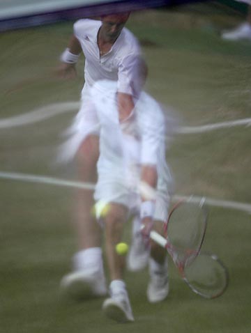 | Russia's Marat Safin is seen reflected in a window as he plays a