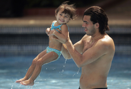 Argentina striker Carlos Tevez plays with his daughter Florencia at the hotel pool in Maracaibo July 1, 2007. Argentina will play against Colombia in the Copa America soccer tournament in Venezuela. [Reuters]