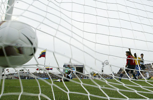 kicked by teammate Roberto Ayala (L) enters the net for an own goal in