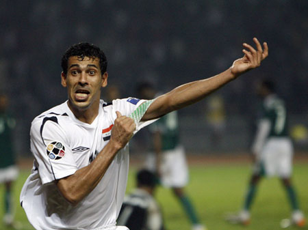 Updated: 2007-07-30 08:55 Iraq's captain Younis Mahmoud celebrates after scoring during their final match against Saudi Arabia at the 2007 AFC Asian Cup soccer tournament at the Gelora Bung Karno stadium in Jakarta July 29, 2007. [Reuters] |