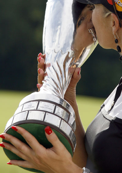 Updated: 2007-07-30 09:23 Natalie Gulbis of the U.S. kisses the tournament trophy during a photo call after winning the 14th Women's Golf Masters in Evian July 29, 2007. [Reuters] |