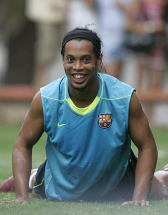 Barcelona's Ronaldinho attends a soccer training session at the Nou Camp Stadium in Barcelona, July 30, 2007. [Reuters]