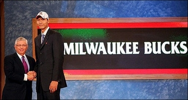 NBA Commissioner David Stern(L) poses for a photo with Yi Jianlian after he was drafted sixth by the Milwaukee Bucks during the 2007 NBA Draft in June 2007. Milwaukee Bucks general manager Larry Harris is confident that Chinese power forward Yi will play for his National Basketball Association club when the season opens in three months. [AFP]