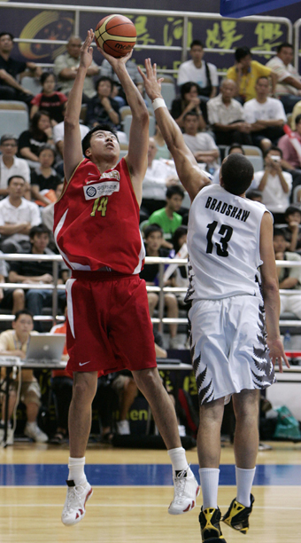 China's Wang Zhizhi (L) shoots as New Zealand's Craig Bradshaw tries to block him during a match of Continental Cup 2007 in Macau August 1, 2007. [Reuters]