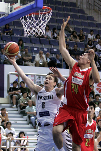 New Zealand's Kirk Penney (L) shoots as China's Sun Yue tries to block him during a match in the Continental Cup 2007 in Macau August 1, 2007.[Reuters]