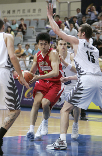 China's Wang Shipeng (C) is blocked by New Zealand's Tony Rampton during a match in the Continental Cup 2007 in Macau August 1, 2007.[Reuters]