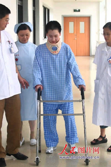 The teenager fell into a coma at the national gymnastics championships in Shanghai June 10 after landing head-first on the mat in her dismount from the uneven bars, fracturing her second and third vertebrae. Sources said after the accident that the young gymnast would likely be paralyzed for life, but after surgery and treatment, her condition improved considerably. According to Dr Tan Shensheng with Shanghai No. 6 hospital, the rehabilitation program for the 15-year-old started last week, adding typing and writing training to regain mobility in her hands. With the rehabilitation treatment, Wang has gradually gained her muscular sense as well as her smiles. “Without any help, I am able to get up, wash my face, eat my meals, send text messages to my friends and play computer games when I’m bored,” the injured teenager laughs. “I am optimistic I can stand up and I want to thank everyone for their concern.” So far, Wang hasn't had any side effects since she moved out of the intensive care unit (ICU). "Any problems during the next period of convalescence will be closely watched to help the gymnast fully stand up,” Xu added.