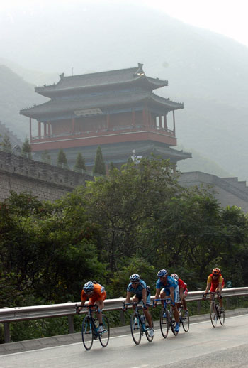 Riders pass the Juyongguan pass section of the Great Wall during the Men's Road Race at the Good Luck Beijing Road Cycling International Invitational Saturday Auguat 18, 2007. The event was a test event for the 2008 Olympic Games. [Xinhua] |