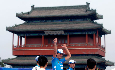 The winner of Men's Road Race at the Good Luck Beijing Road Cycling International Invitational from Italy (C) celebrates at the terminal of the race, the Juyongguan pass section of the Great Wall August 18, 2007. The event was a test event for the 2008 Olympic Games. [Xinhua]