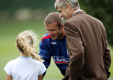 England's David Beckham (C) talks with Arsenal manager Arsene Wenger (R) and an unidentified girl during an England training session at London Colney, near London, August 20, 2007. England will play against Germany in an international friendly soccer match at Wembley on Wednesday. [Reuters] |