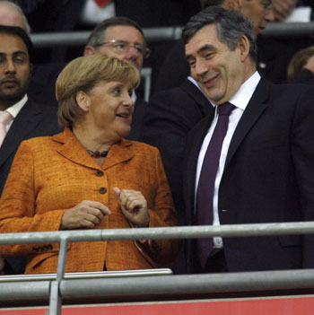Britain's Prime Minister Gordon Brown (R) shares a joke with German Chancellor Angela Merkel before the friendly international soccer match between England and Germany in London August 22, 2007. [Reuters] |