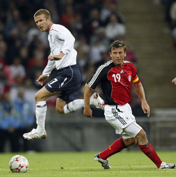 England's David Beckham (L) challenges Germany's Bernd Schneider (R) for the ball during their international friendly soccer match in London, England, August 22, 2007. Beckham played the entire game but England lost 2-1. [Reuters] |