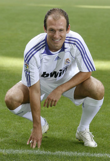 Real Madrid's new signing Dutch winger Arjen Robben poses during his presentation at the Santiago Bernabeu stadium in Madrid August 23, 2007. [Reuters]