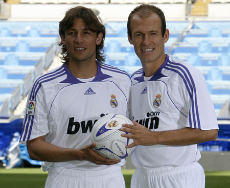 Real Madrid's new signings Dutch winger Arjen Robben (R) and Argentine defender Gabriel Heinze pose during their presentation at the Santiago Bernabeu stadium in Madrid August 23, 2007. [Reuters]