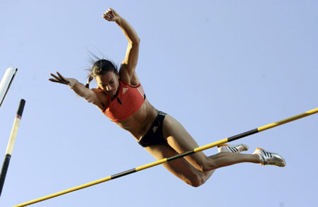 Yelena Isinbayeva of Russia clears the bar to win the women's pole vault at the IAAF Golden League athletics meet in Oslo June 15, 2007. [Reuters] |