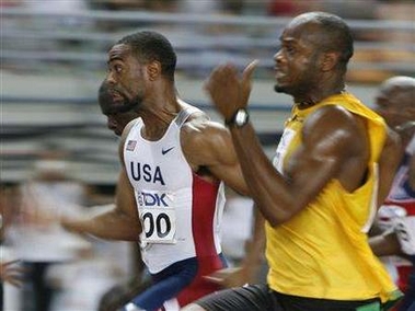 Tyson Gay of the U.S. and Asafa Powell of Jamaica (R) compete in the men's 100 metres final at the 11th IAAF World Athletics Championship in Osaka August 26, 2007. [AP] |
